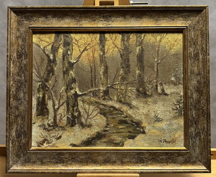 Obraz - Zima u řeky. Signován vpravo dole - viz foto. Autorem je malíř Karel Pospíšil.