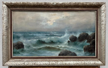 Obraz - Moře - Vlny u skalisek. Signován vpravo dole - viz foto. Autorem je malíř František Šourek. Obraz galerijní kvality a velikosti, navíc na plátně. Na první pohled je vidět, že František Šourek si dal na tomto obraze záležet, jedná se o velmi kvalitní dílo.