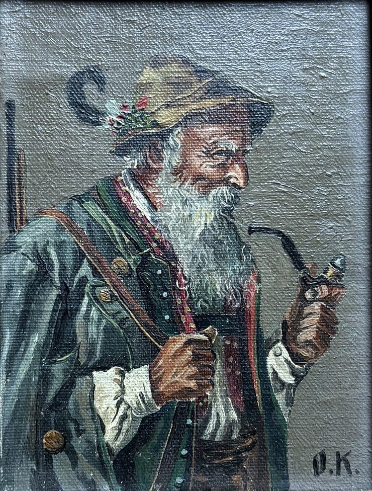 Obraz - Portrét bavorského myslivce s dýmkou. Signován O. K. vpravo dole - viz foto, autorem je zřejmě Otto Kirchner - viz analýza níže, posuďte však raději sami.