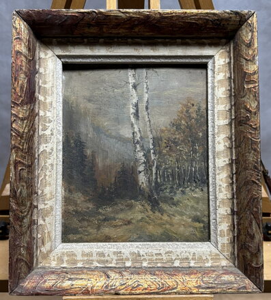 Rozměry včetně rámu cca 26 cm x 23 cm, rám je zdobený, místy má otluky. Olej na kartonu. Celkový stav - viz foto.