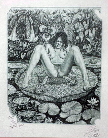 Obraz - Akt Ztracený ráj V. (Akt, erotika, sex). Autorem je malíř a grafik Günter Hujber. Signován a datován vpravo dole - viz foto. Autorský tisk (Épreuve d'Artiste) a číslován XXVI/XXX vlevo dole - viz foto.