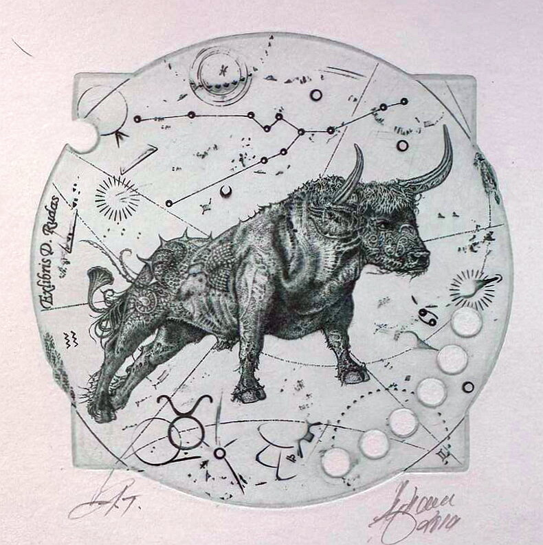 Detailně propracovaná postava býka, jehož tělo je pokryto jemnými texturami a symbolickými vzory připomínajícími mechanické součástky nebo organické struktury. V horní části listu je zachyceno schéma souhvězdí Býka. Vlevo dole a v pravé části kruhové kompozice se nachází grafický symbol pro toto znamení (kruh s rohy).