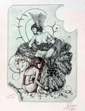 Obraz - Akt Burleska. (Akt, erotika, sex). Autorem je malíř a grafik Günter Hujber. Signován a datován vpravo dole - viz foto. Autorský tisk (Épreuve d'Artiste) vlevo dole - viz foto.