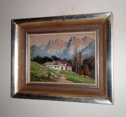 OBRAZ - CHALUPA POD HORAMI. SIGNOVÁN VPRAVO DOLE - VIZ FOTO. AUTOREM JE MALÍŘ SCHLÄGER.
