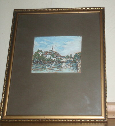 ROZMĚRY RÁMU CCA 32 CM x 27,5 CM, SAMOTNÁ MALBA CCA 14 CM x 10,5 CM, RÁM JE ÚZKÝ, KRÁSNĚ ZDOBENÝ, MÁ MÍSTY OTLUKY. KOMBINOVANÁ TECHNIKA - ZŘEJMĚ PEROKRESBA A OLEJ ČI TEMPERA NA PAPÍŘE. OBRAZ JE ZASKLENÝ. CELKOVÝ STAV - VIZ FOTO.