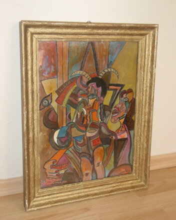 KUBISTICKY POJATÝ OBRAZ - "DOLLY UND THERESIE". AUTOREM JE MALÍŘ JOSEF DUBIEL VON LERACH. OBRAZ JE SIGNOVÁN VLEVO DOLE - VIZ FOTO. DÁLE TRADIČNÍ OZNAČENÍ ESLK (ENTARTETE SCHLESIEN LERACH KUNST) - VPRAVO DOLE - VIZ FOTO. ZEZADU OBRAZU JE UVEDEN NÁZEV DÍLA, TECHNIKA, VELIKOST, RAZÍTKA, PODPIS ATD. - VŠE VIZ FOTO.