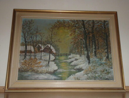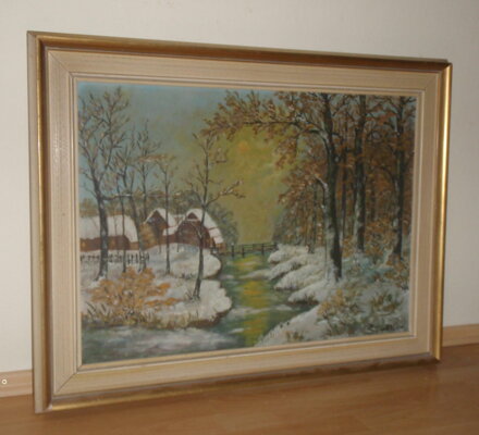 OBRAZ - ZIMNÍ KRAJINKA - POTOK VE VESNIČCE. SIGNOVÁN VPRAVO DOLE - VIZ FOTO. AUTOREM JE FALC.