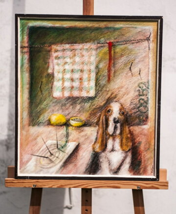 OBRAZ - BASET - ZÁTIŠÍ S BASETEM. SIGNOVÁN VPRAVO DOLE - VIZ FOTO. AUTOREM JE CENĚNÝ A VYHLEDÁVANÝ MALÍŘ RUDOLF MIKYŠKA.