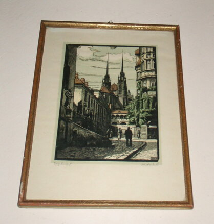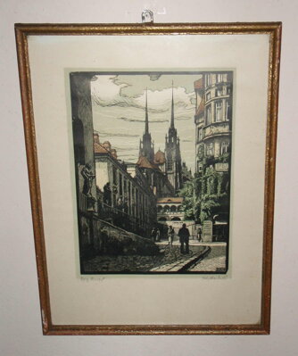 OBRAZ - POHLED NA PETROV - BRNO. SIGNOVÁN VPRAVO DOLE - VIZ FOTO. TECHNIKA ORIGINÁLNÍ DŘEVORYT - UVEDENO VLEVO DOLE - VIZ FOTO. AUTOREM JE MALÍŘ A GRAFIK KAREL KOUBEK.