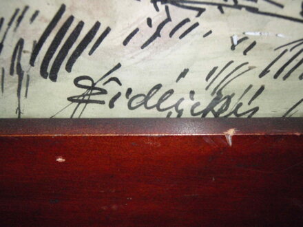 Rozměry včetně rámu cca 56 cm x 47 cm, rám je mohutný, zdobený, místy má otluky. Obraz je zasklený.Kolorovaná perokresba zřejmě akvarelem na papíře či kartonu. Celkový stav - viz foto.