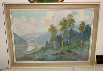 OBRAZ - BŘÍZY NAD ŘEKOU. AUTOREM JE ZŘEJMĚ - JAROMÍR KAMENÍČEK. SIGNOVÁN VPRAVO DOLE - VIZ FOTO. OBRAZ GALERIJNÍ KVALITY A VELIKOSTI, NAVÍC NA PLÁTNĚ. NA PRVNÍ POHLED JE VIDĚT, ŽE SI AUTOR NA TOMTO OBRAZE DAL VELMI ZÁLEŽET, JEDNÁ SE O VELMI KVALITNÍ DÍLO.