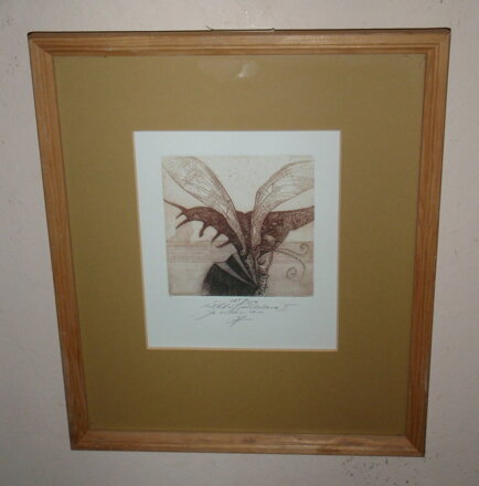 Rozměry včetně rámu cca 30 cm x 26 cm. Rám je úzký, dřevěný, místy má oděrky. Zřejmě lept či suchá jehla na papíře. Obraz je zasklený. Celkový stav - viz foto.