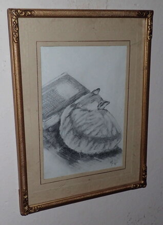 OBRAZ - KOČKA SCHOULENÁ DO KLUBÍČKA. SIGNOVÁN A DATOVÁN VPRAVO DOLE - VIZ FOTO. AUTOREM JE MALÍŘ LUBOŠ JEŘÁBEK. OSOBITÝ, PRECIZNÍ STYL KRESBY.