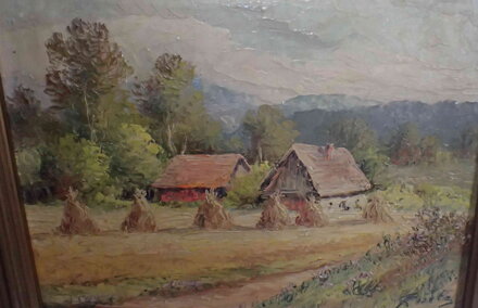 Obraz - Žně v Pozlovicích u Luhačovic. Signován vpravo dole - viz foto. Autorem je malíř Pavel Raszka. Zezadu obrazu je uveden název díla a tehdejší cena - viz foto.
