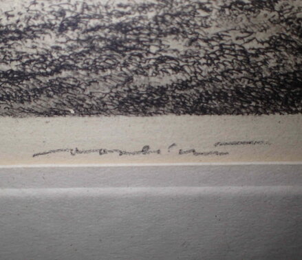 Rozměry včetně rámu cca 57 cm x 48 cm. Rám je úzký, zdobený, místy má otluky - viz foto. Signovaná litografie či suchá jehla na papíře. Obraz je zasklený. Celkový stav - viz foto.