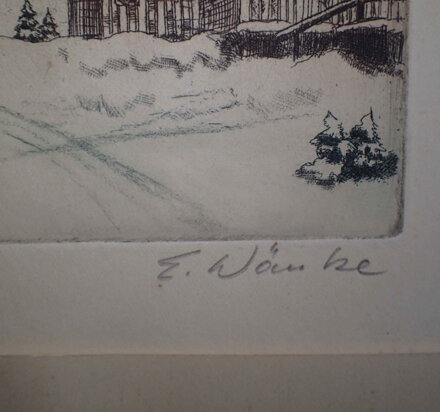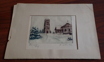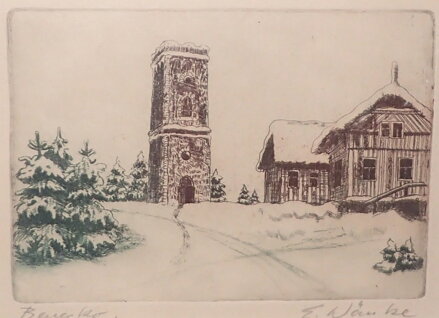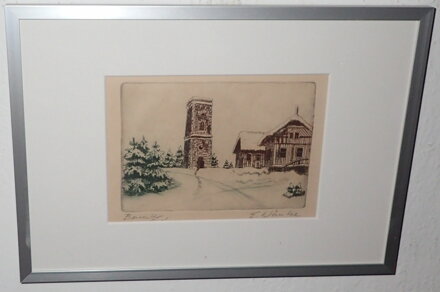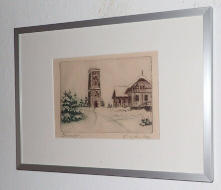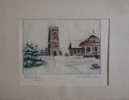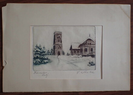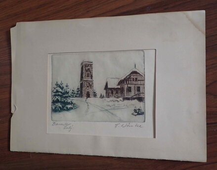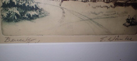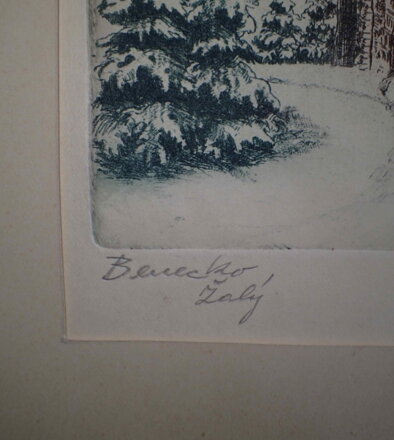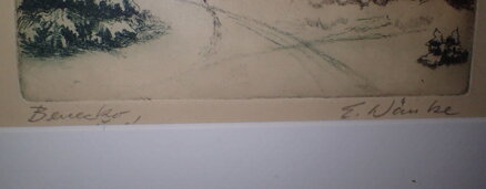 Originální signovaný barevný lept na papíře - Benecko Žalý. Signován vpravo dole - viz foto. Název díla vlevo dole - viz foto. Autorem je malíř a grafik Emil Wänke. Zezadu je autorské razítko - viz foto.