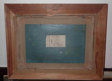 Zezadu obrazu je autorský štítek kde je uveden: název díla, autor, rozměr, technika, tehdejší cena, rok atd. - vše viz foto.