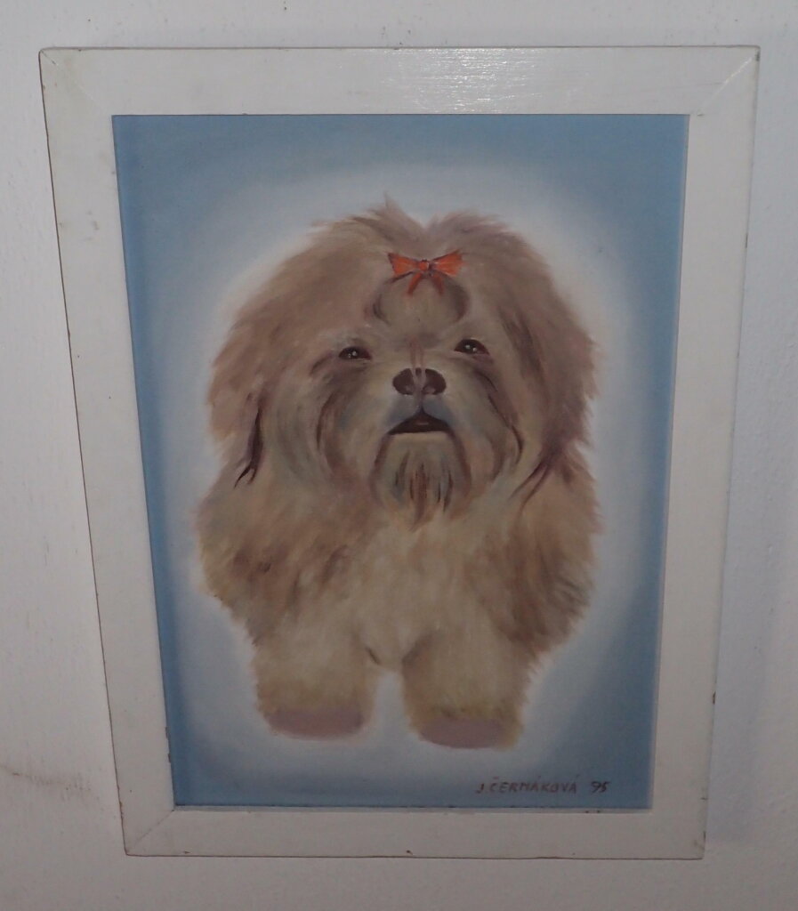 Obraz - Teddy - Maltézáček. Signován a datován vpravo dole - viz foto. Autorkou je malířka Jitka Čermáková. Zezadu obrazu je autorský štítek, kde je uveden název díla, autorka, technika, rozměr, razítko galerie D atd. - vše viz foto.