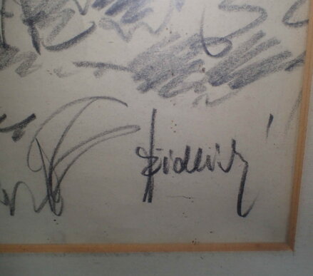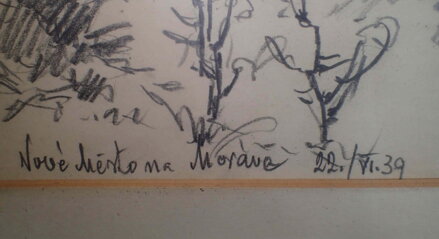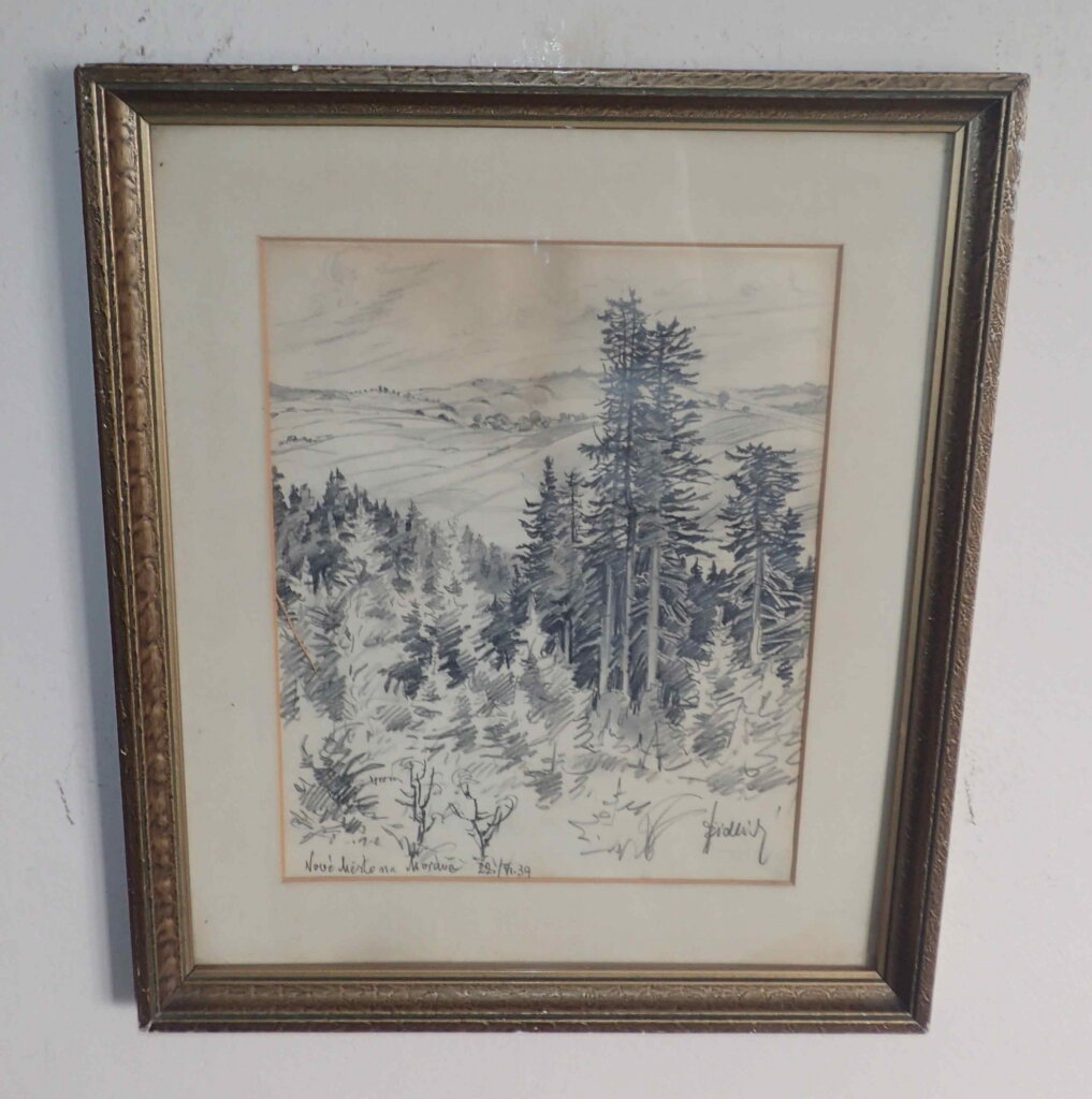 Rozměry včetně rámu cca 40 cm x 32 cm, rám je úzký, místy má otluky. Obraz je zasklený. Tužka na papíře. Celkový stav - viz foto.