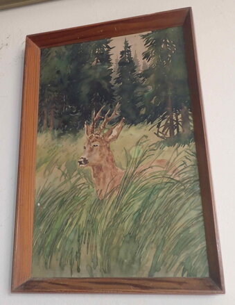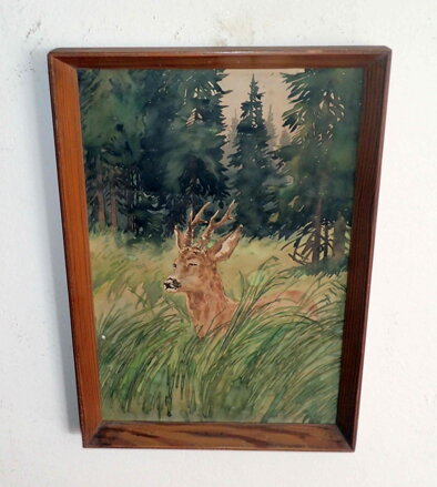 Obraz - Srnec na pastvě. Autorem je vyhledávaný malíř zvěře Jiří Židlický.Povedený obraz - pěkných obrazů s loveckými motivy není na trhu mnoho.