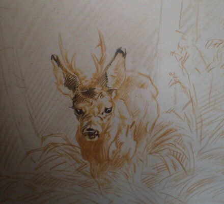 Obraz - Srnec ve vysoké trávě. Signován vpravo dole - viz foto. Autorem je vyhledávaný malíř zvěře Jiří Židlický.Povedený obraz - pěkných obrazů s loveckými motivy není na trhu mnoho.