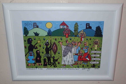 Obraz - Praotec Čech vítá uprchlíky. Autorem je známý malíř, grafik, hudebník, divadelník, spisovatel a textař František Ringo Čech. Signován a datován vpravo dole - viz foto. Umělecký tisk vlevo dole - viz foto. Název díla uprostřed dole - viz foto. Osobitý naivistický styl, pestrá paleta barev, specifický druh humoru.