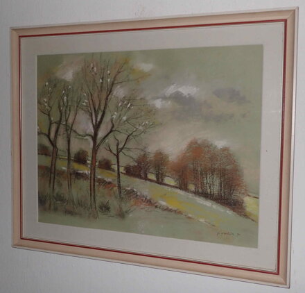 Rozměry včetně rámu cca 74 cm x 60 cm, rám je zdobený, místy má otluky. Křídový pastel na papíře. Na fotkách jsou místy odlesky od blesku. Obraz je zasklený. Celkový stav - viz foto.
