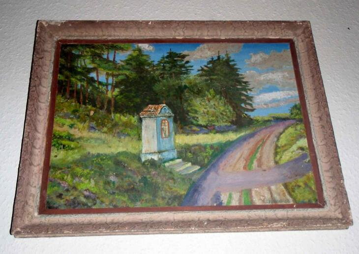 Obraz - Kaplička u cesty. Zezadu obrazu je napsáno Sýkora Honza - svaté obrázky. Tak autorem je snad malíř Sýkora.