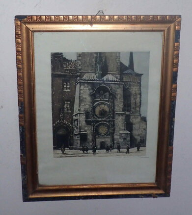 Rozměry včetně rámu cca 60 cm x 48 cm, rám je bohatě zdobený, má hodně otluků. Barevný signovaný lept na papíře. Obraz je zasklený. Celkový stav - viz foto.