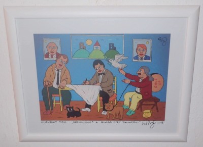 Obraz - Zeman, Gott a Ringo píší Trumpovi. Autorem je známý malíř, grafik, hudebník, divadelník, spisovatel a textař František Ringo Čech. Signován a datován vpravo dole - viz foto. Umělecký tisk vlevo dole - viz foto. Název díla uprostřed dole - viz foto. Osobitý naivistický styl, pestrá paleta barev, specifický druh humoru.