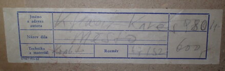 Obraz - Město. Autorem je malíř Karel Slabý Kareš. Zezadu obrazu je autorský štítek, kde je uveden autor, název díla, technika, rozměr a tehdejší cena. Vše viz foto.