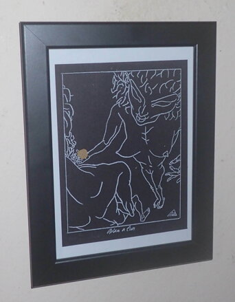 Obraz - Adam a Eva. Autorem je malíř a grafik Boris Jirků. Signován vpravo dole - viz foto. Autorský tisk vlevo dole - viz foto. Název díla uprostřed dole - viz foto.