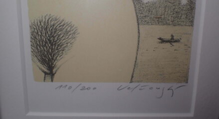 Originální barevná signovaná číslovaná litografie - Černé jezero. Autorem je malíř a grafik Josef Velčovský. Signovaná vpravo dole - viz foto. Číslovaná 110/200 vlevo dole - viz foto.