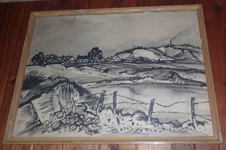 Rozměry včetně rámu cca 65 cm x 48 cm, rám je úzký, místy má otluky. Kombinovaná technika, tuž a paste na papíře. Obraz je zasklený. Celkový stav - viz foto.