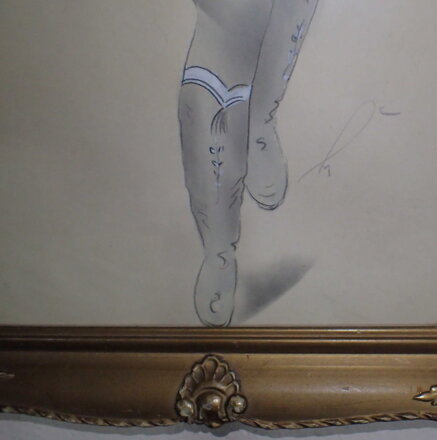 Rozměry včetně rámu cca 43 cm x 33 cm, rám je bohatě zdobený, místy má otluky. Kombinovaná technika - tužka, úhel a běloba na papíře. Obraz je zasklený. Celkový stav - viz foto.