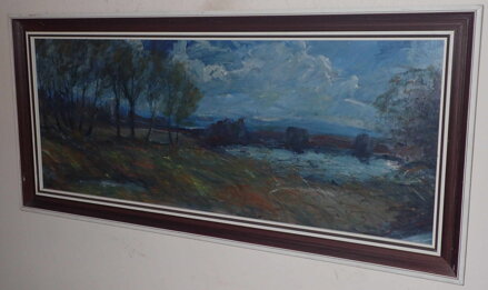 Rozměry včetně rámu úctyhodných cca 103 cm x 48 cm, rám je zdobený, místy má otluky. Olejová tempera na kartonu. Celkový stav - viz foto.