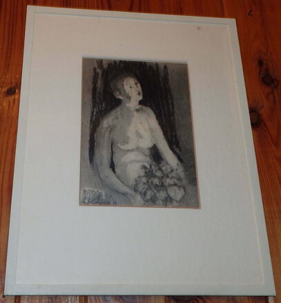 Obraz - Akt ženy s kyticí. Autorkou je malířka a grafička Stanislava Konrádová Břežková (Slávka). Signován a datován vlevo dole - viz foto.
