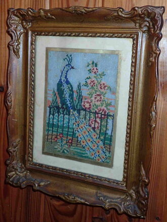 Rozměry včetně rámu cca 31 cm x 25 cm, rám je krásně zdobený, místy má otluky. Tkaný obraz. Obraz je zasklený. Celkový stav - viz foto.
