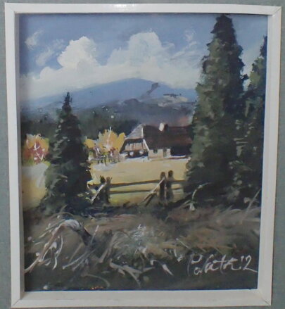 Obraz - Chalupa pod Antýglem. Signován a datován vpravo dole - viz foto. Autorem je akademický malíř Karel Polata. Expresionistický styl malby. Zezadu obrazu je název díla - viz foto. Na další obrazy od tohoto autora se můžete podívat zde...