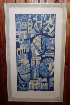 Rozměry včetně rámu cca 76 cm x 43 cm, rám je zdobený, místy má otluky. Barevný linoryt na papíře. Obraz je zasklený. Celkový stav - viz foto.