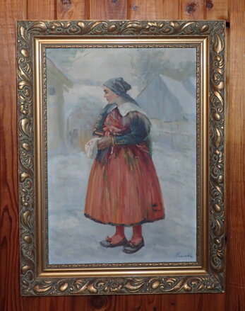 Obraz - Dražinovská selka Chodsko. Signován vpravo dole - viz foto. Autorem je malíř Karel Otto Hamrlík (Hamerlík). Zezadu obrazu je název díla - viz foto. V prodeji máme párový obraz od tohoto malíře s názvem "Chodský dudák Domažlice", který má stejnou techniku, téma, rozměr a rám - viz foto.