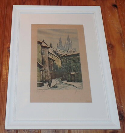 Rozměry včetně rámu cca 45 cm x 35 cm. Originální signovaný barevný lept + akvatinta na papíře. Obraz je adjustován do nového rámu. Celkový stav - viz foto.