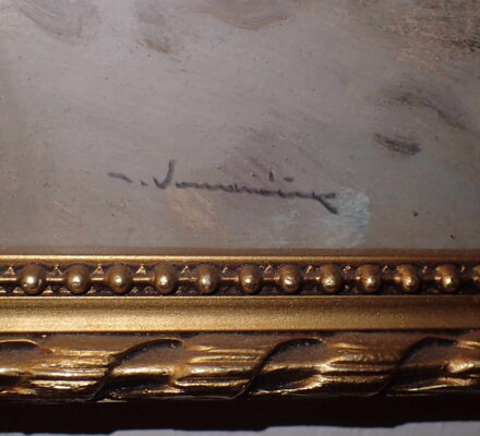 Rozměry včetně rámu cca 58 cm x 43 cm, rám je úzký, zdobený, místy má otluky. Olej či tempera na kartonu. Obraz je zasklený. Celkový stav - viz foto.