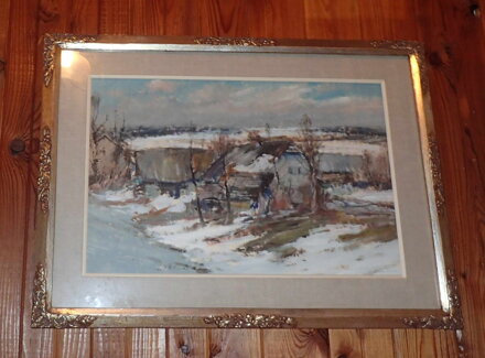 Velký obraz - Zima ve vesničce. Autorem je malíř Vondráček Josef. Signován vpravo dole - viz foto.