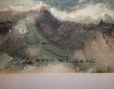 Rozměry včetně rámu cca 77 cm x 33 cm. Rám je zdobený, místy má otluky. Akvarel na papíře. Obraz je zasklený. Celkový stav - viz foto.