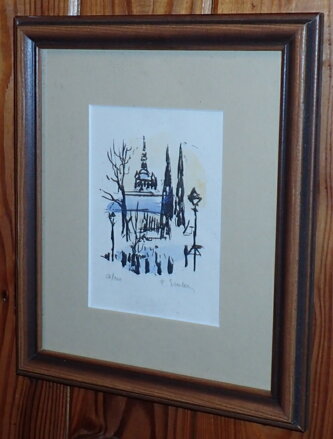 Originální barevná signovaná číslovaná litografie - Lucerny pod Chrámem svatého Víta Praha (Pragensia). Signovaná vpravo dole - viz foto. Číslovaná 58/100 vlevo dole - viz foto. Autorem je akademický malíř a grafik František Emler.