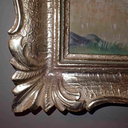 Rozměry včetně rámu cca 48 cm x 64 cm. Rám je mohutný, krásně a bohatě zdobený, místy má otluky - viz foto. Olej na kartonu. Celkový stav - viz foto.
