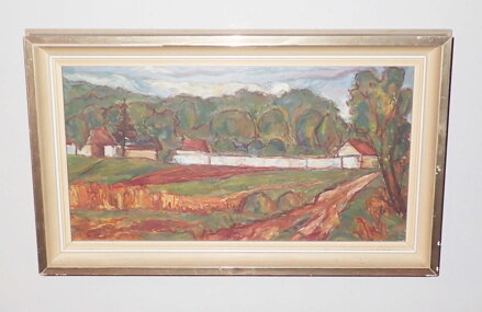 Obraz - Lhotka u České Třebové nad hřbitovem. Autorem je pardubický malíř Jiří Kostka (studium u F. V. Danihelky). Zezadu obrazu je uveden autor a název díla - viz foto.
