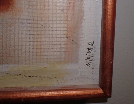 Rozměry včetně rámu cca 44 cm x 49 cm, rám je úzký, místy má otluky. Akryl na plátně. Celkový stav - viz foto.