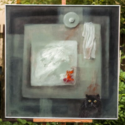 Rozměry včetně rámu úctyhodných cca 96 cm x 96 cm, rám je úzký, místy má otluky. Akryl na plátně. Celkový stav - viz foto.